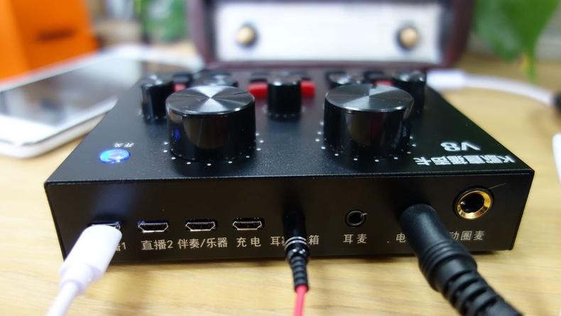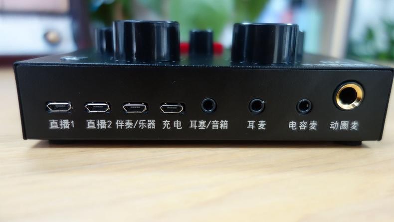 V8声卡的背面就是全部接口了,值得注意的是这块声卡配备了实时耳返,能时刻听到自己的声音效果。并且这款声卡手机电脑都能用,兼容安卓和苹果各种APP,不论是手机直播还是电脑直播都能体验到声卡的效果。