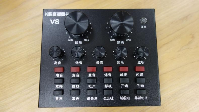 这就是声卡套装里最重要的部分——V8声卡,可以看到正面的按钮还是非常多的,最上方最大的是话筒和混响的音量调节,下面一排5个黑色的旋钮则是用来调节人声和监听音量的:高音、低音、录音、音乐、监听。接下来的一排红色按钮则是5种声音音效,比如常见的男女变声和萝莉音,都能一键变声,直播唱歌,喊麦不在话下。最下面的就是12种直播音效,经常看见别的主播,讲了笑话以后,就用这个欢呼鼓掌的音效来活跃直播间的氛围,而这个V8声卡上一下就拥有12种,厉害了。