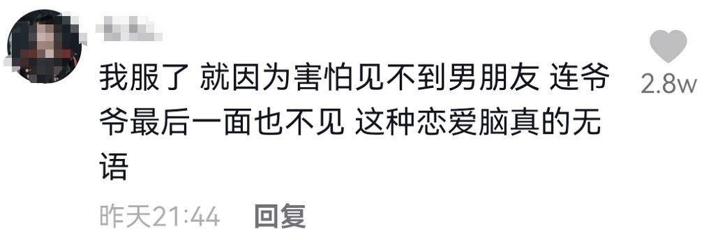 “我服了,就因为害怕见不到男朋友,连爷爷最后一面也不见,这种恋爱脑真的无语。”