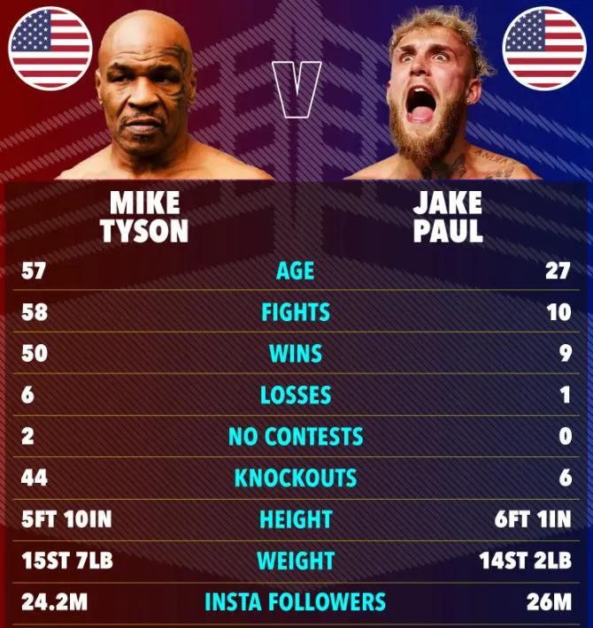 这场备受关注的对决将在德克萨斯州阿灵顿的AT&T球场进行,这个举世闻名的场馆将成为两位拳击手角逐胜负的舞台。泰森和保罗之间的年龄差距足足有20岁,这让这场对决更加引人注目。