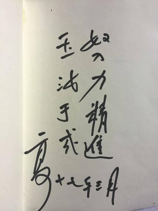 在采访的最后,二月河手还写一句话寄语华西都市报的读者:努力精进,玉汝于成。