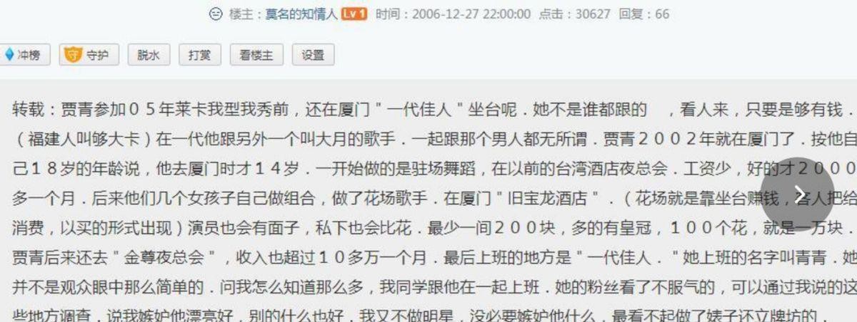 不过话说回来,贾青的确有一副漂亮的皮囊,在演艺圈也渐入佳境,人气节节高升。可就在这时,一阵狂风劲吹,将她私下里的那些龌龊勾当尽数暴露在了众人的视线之下。有人就指证贾青最喜欢和有钱人、有家室的男人纠缠不清,图个一己之私利。王思聪那个圈内大佬更是亲自转发了爆料人的帖子,大动干戈式地曝光了贾青的一系列荒淫无度行径,配上大尺度猥亵照片,当真是一阵腥风血雨。一时间,贾青也成了众矢之的,口碑堪忧。