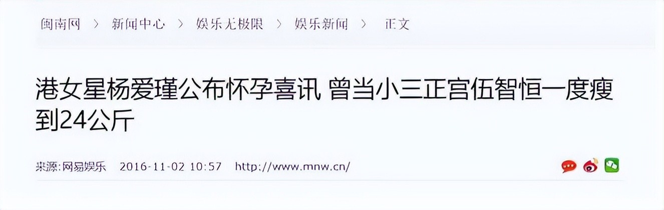 闽南网-《港女星杨爱瑾公布怀孕喜讯 曾当小三正宫伍智恒一度瘦到24公斤》