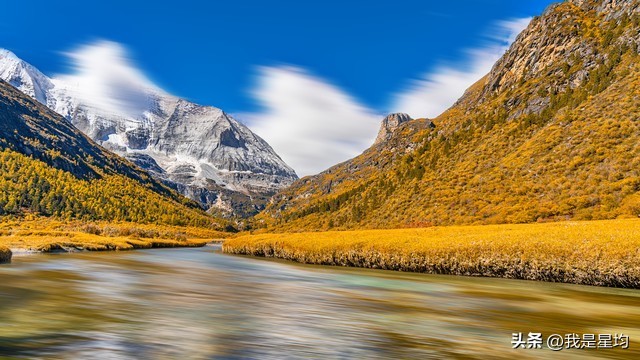 稻城亚丁位于四川省甘孜藏族自治州稻城县,被誉为“最后的香格里拉”,秋天是稻城亚丁最美的季节之一。秋季的稻城亚丁,黄、橙、红三色交织成的树林让这片圣地愈发迷人,是徒步旅行和摄影爱好者的理想目的地。