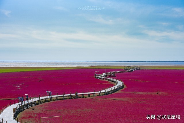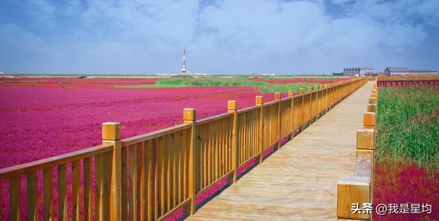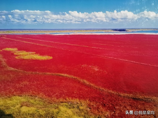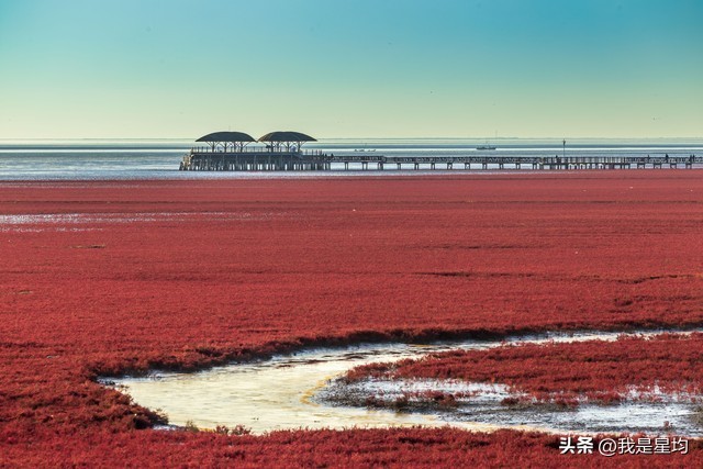 辽宁盘锦的秋天是一幅美丽的自然画卷,其中最著名的景点就是红海滩国家风景廊道。红海滩的红色是由一种名为碱蓬草的植物形成的,这种草在春季开始生长,到了秋季会变成鲜艳的红色,因此每年9月至10月是最佳观赏期。