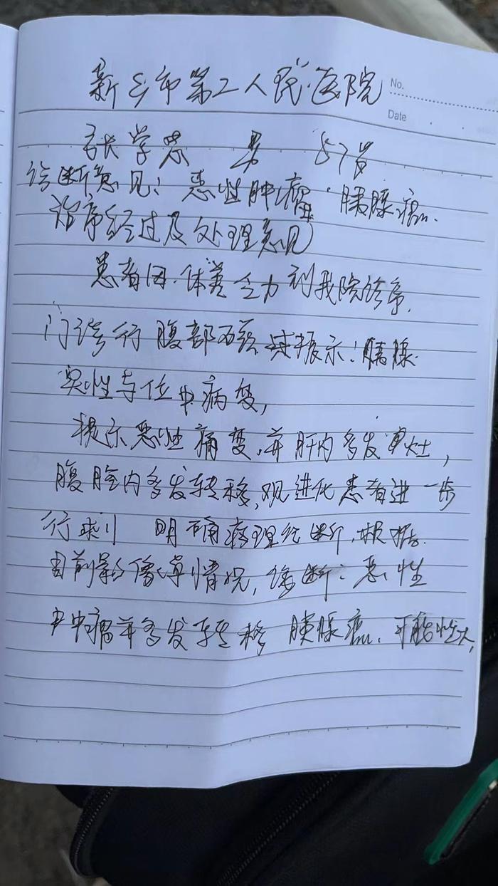 8月3日,张学忠的儿子张露明称,8月1日接到管教电话说我父亲得了胰腺癌,目前,在新乡市第二人民医院就医,现在申请保外就医。由于不让拍照,张露明手抄了一份诊断书,上面显示,57岁的张学忠被诊断为恶性肿瘤,胰腺癌。