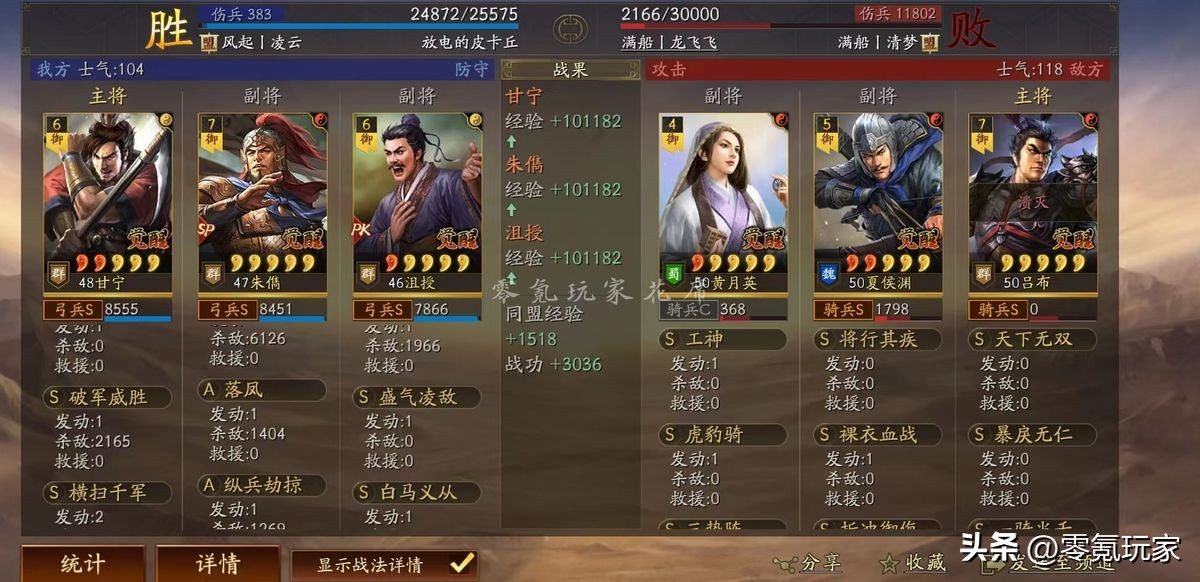 花席之前发过类似的攻略,可以玩西凉铁骑,也可以玩弓兵,这次粉丝“放电的皮卡丘”投稿的战报是甘宁、朱儁的弓兵暴击流。