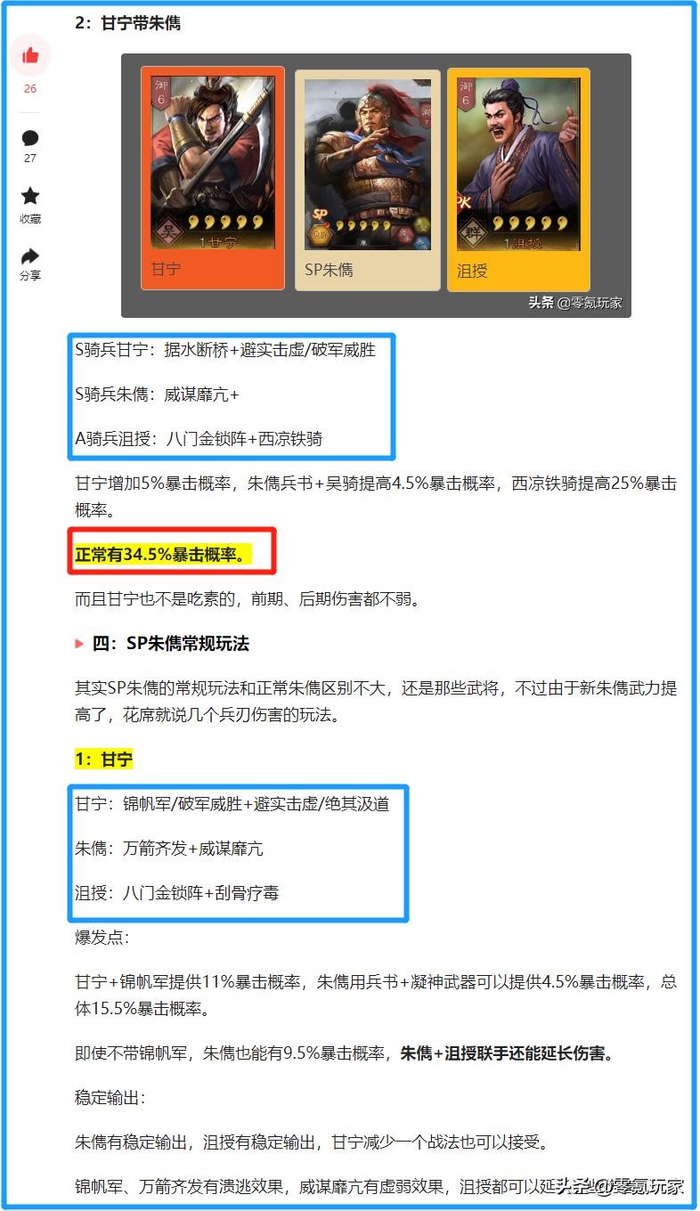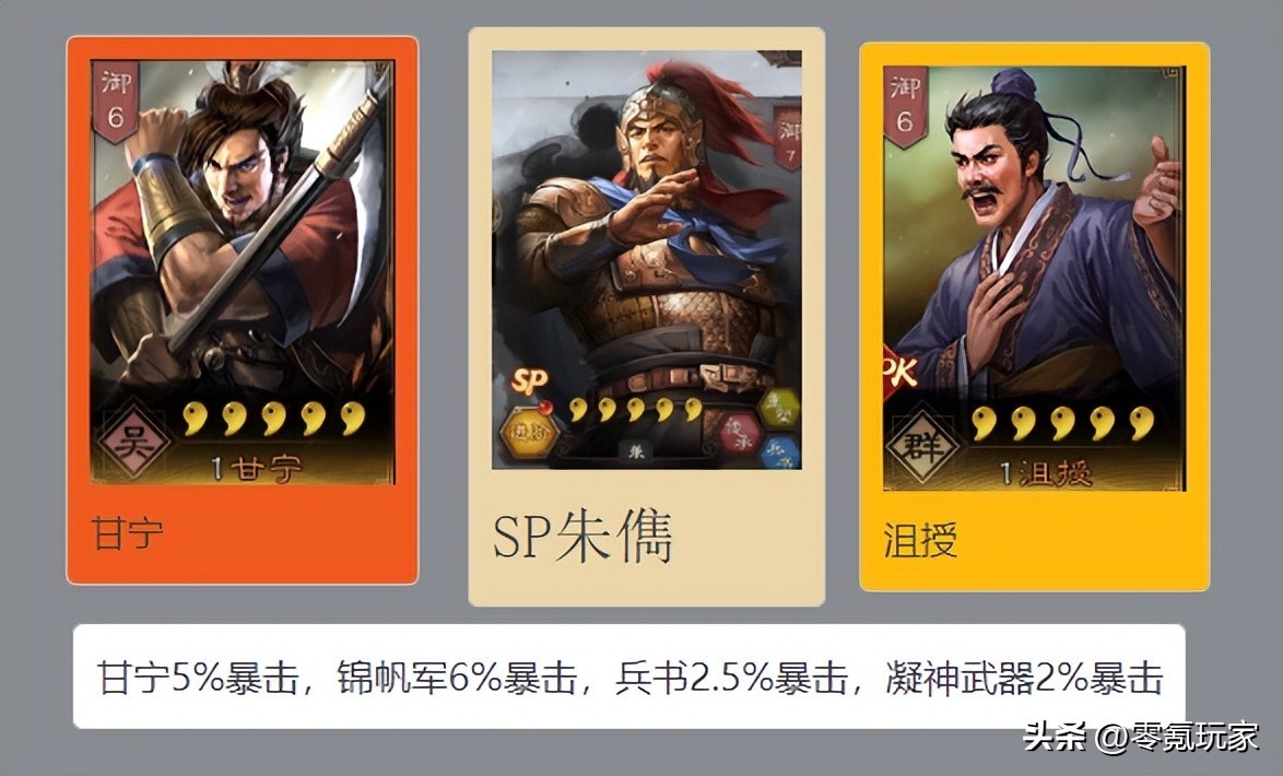 总的来说,甘宁+SP朱儁算是个可玩的方案,给SP朱儁增加暴击后,队伍的变数更大,触发暴击时就能让敌人很奇怪。