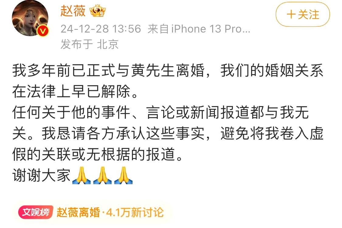 2024年12月28日,赵薇通过微博发布公告,正式宣布与丈夫黄有龙离婚。她在声明中强调,两人已于多年前正式离婚,婚姻关系在法律上早已解除。赵薇恳请大家不要再将她与黄有龙的事务混为一谈,以免带来不必要的困扰。