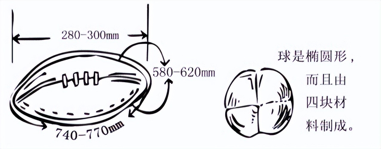 橄榄球为椭圆形,长11-11.5英寸(27.94-29.21厘米),纵周长30-31英寸(76.2-78.7厘米),横周长24-25 英寸(60.96 -64.77厘米),球重13 -15盎司(382.72-425.24克)。