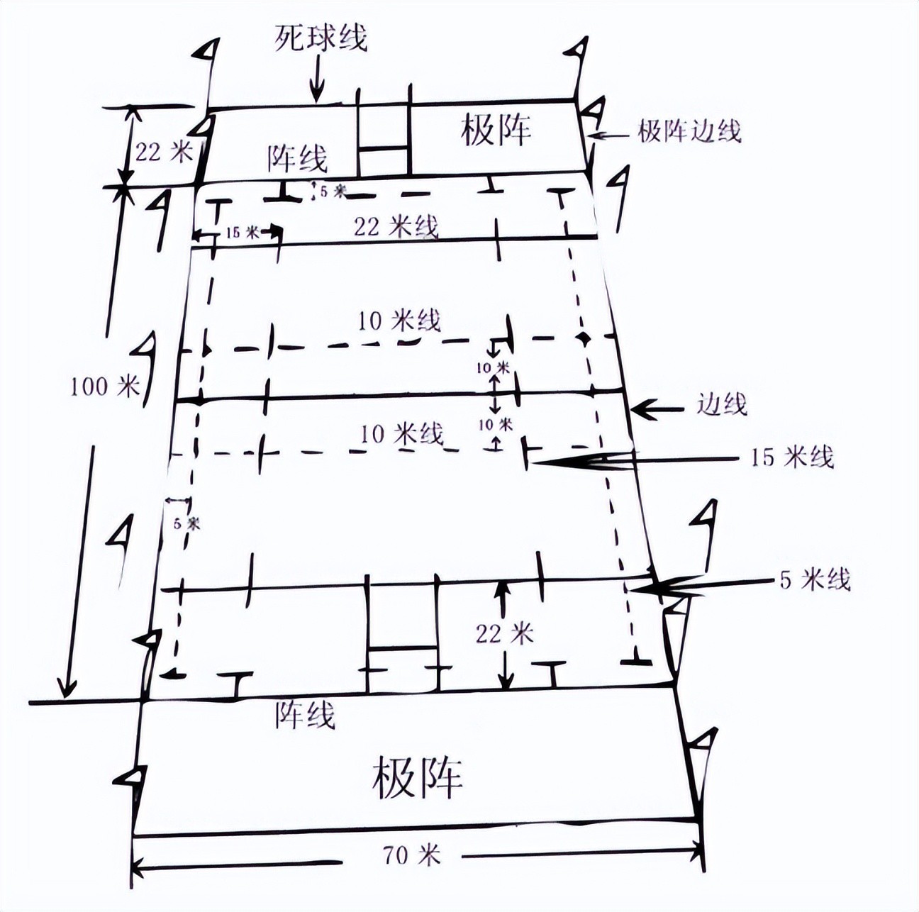 球员可以通过达阵和射门的方式斩获分数,当然,在达阵和射门之前,球员之间会有一系列传球配合,传球只能是回传球或横传球,不可向前传球。防守一方的对手会想方设法阻拦进攻方前进或射门得分。比赛的时间为14分钟,上下半场各7分钟,中场休息2分钟。