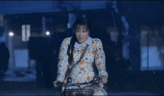 六十多岁的时候,她演了个女学生,水灵灵地拍孕妇雨中骑车戏,