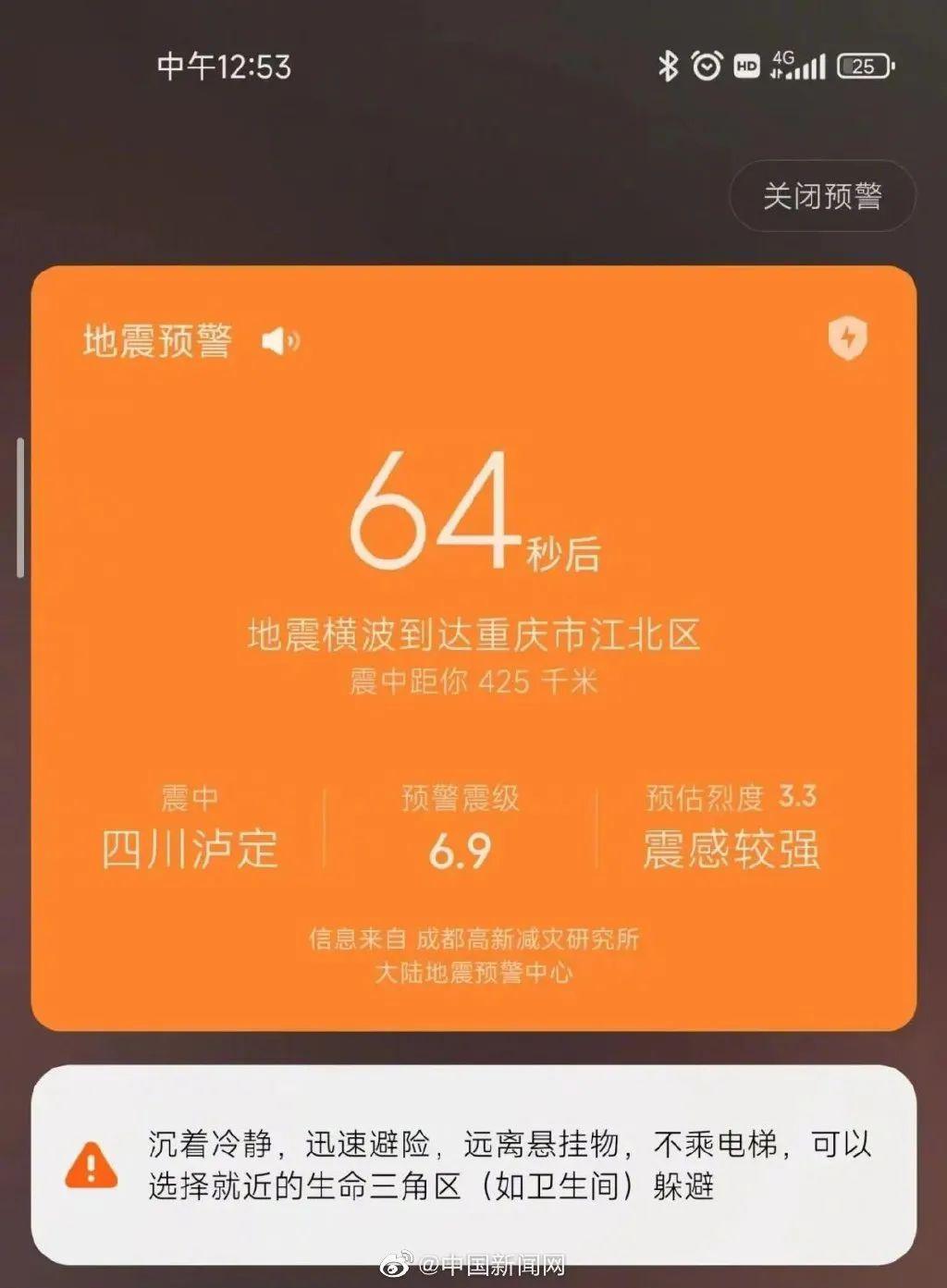 同时,有不少媒体报道,地震发生前,四川、重庆居民发了自己手机中的地震预警,其中一名重庆网友预警截图显示,"64 秒后地震横波到达重庆市江北区,震中四川泸定,预警震级 6.9 级,震感较强。"