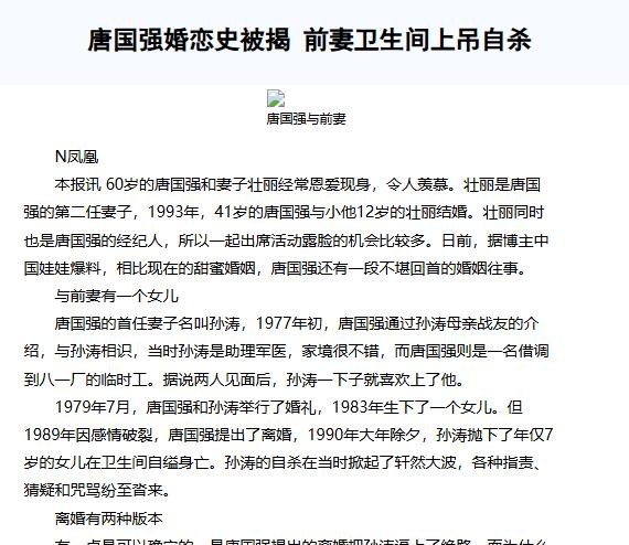 海峡网《唐国强婚恋史被揭 前妻卫生间上吊自杀》