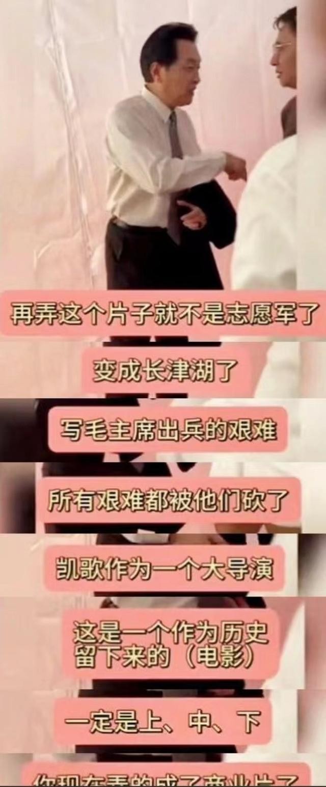 “写毛主席出兵的艰难,所有艰难都被他们砍了。凯歌作为一个大导演,这是一个作为历史留下来的电影,一定是上中下,你现在弄的成了商业片了。”