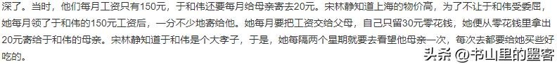 宋林静知道上海花销非常大,于是为了让于和伟过得好一些,她总是将于和伟那150块的工资原封不动的寄给他,自己的150块更是分成了3份一份给父母,一份给于和伟母亲,最小的一份留给自己。
