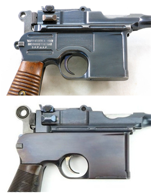 上图是普通毛瑟手枪(上)和大镜面毛瑟手枪(下)右侧机匣的特写。
