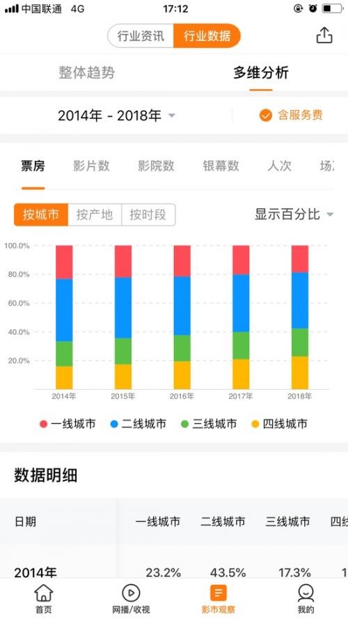 “多维度分析功能”以分线城市、影片产地、黄金及非黄金时段为指标,以年为维度,对近几年的电影行业发展状况进行清晰、准确的分析,得出占比趋势,进一步深度解读行业发展。在这一功能下,例如“近年来不同线城市平均票价如何变化”、“不同时间段的上座率变化关系是否一致”等问题将得到解答。