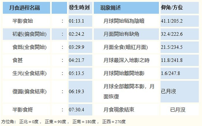 2018年7月28日月全食可见之各过程发生时刻(台湾标准时间TST,UTC +08:00)