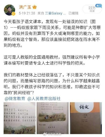 【小学语文蚂蚁搬家要下雨被质疑不科学 出版社回应:将研判】“蚂蚁搬家蛇过道,大雨不久要来到。”小学语文课本里的这句话很多人都耳熟能详。但近日,学生家长@洪广玉 质疑这句话的科学性,并称,人民教育出版社一年级下册语文教材中这句有关“蚂蚁搬家”的语句有误,蚂蚁怎么能测算出雨多大会淹了窝呢?洪广玉建议,中小学课本编写时要请专业人士进行科学性把关。对此,5月21日,人民教育出版社宣传部一位工作人员告诉记者,会把这位家长的质疑发给编辑室老师进行研判。(澎湃新闻)家长质疑小学教材“蚂蚁搬家要下雨”不科学,出版社:将研判