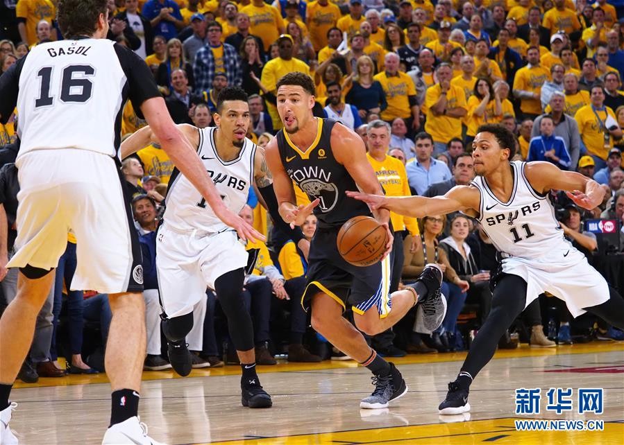 ↑4月16日,勇士队球员汤普森(右二)在比赛中进攻。新华社/路透