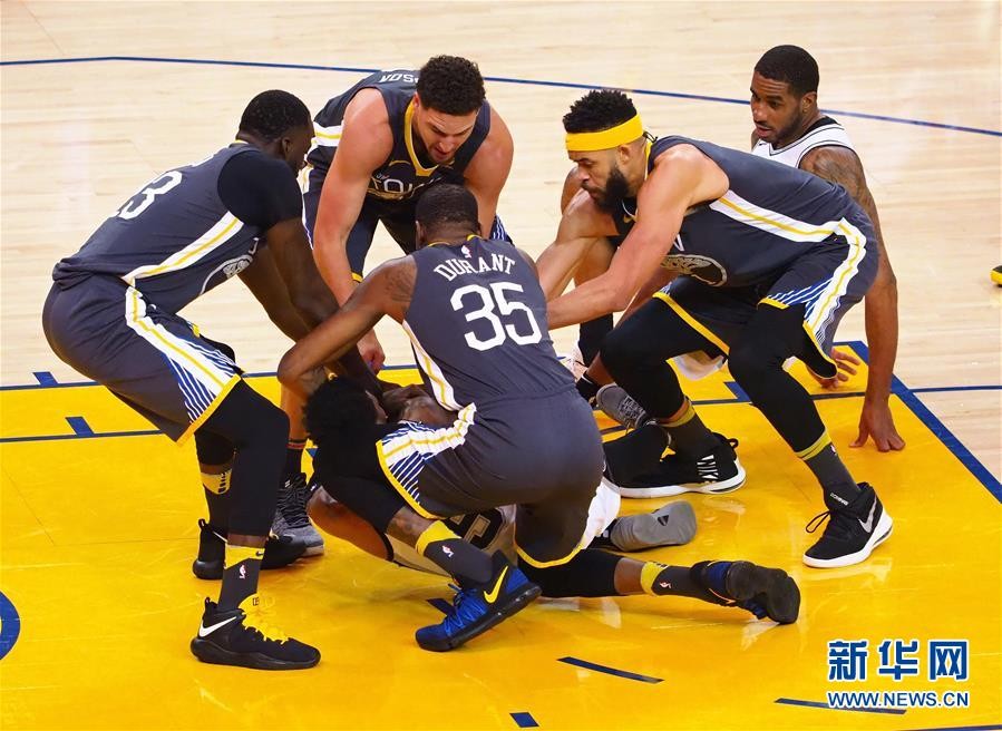 ↑4月16日,勇士队球员杜兰特(前)、汤普森(后)、格林(左)和麦基与马刺队球员穆雷(中)拼抢。新华社/路透