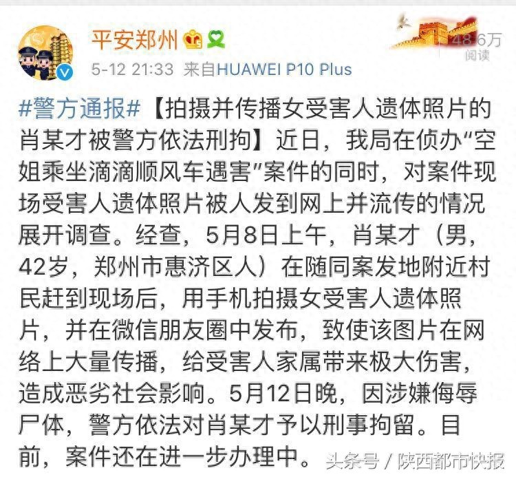 经查,5月8日上午,肖某才(男,42岁,郑州市惠济区人)在随同案发地附近村民赶到现场后,用手机拍摄女受害人遗体照片,并在微信朋友圈中发布,致使该图片在网络上大量传播,给受害人家属带来极大伤害,造成恶劣社会影响。
