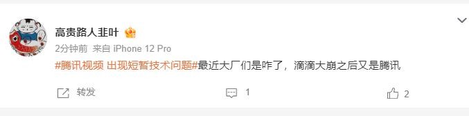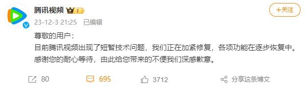 大量网友发帖称腾讯视频崩了,官方紧急回应:出现了短暂技术问题