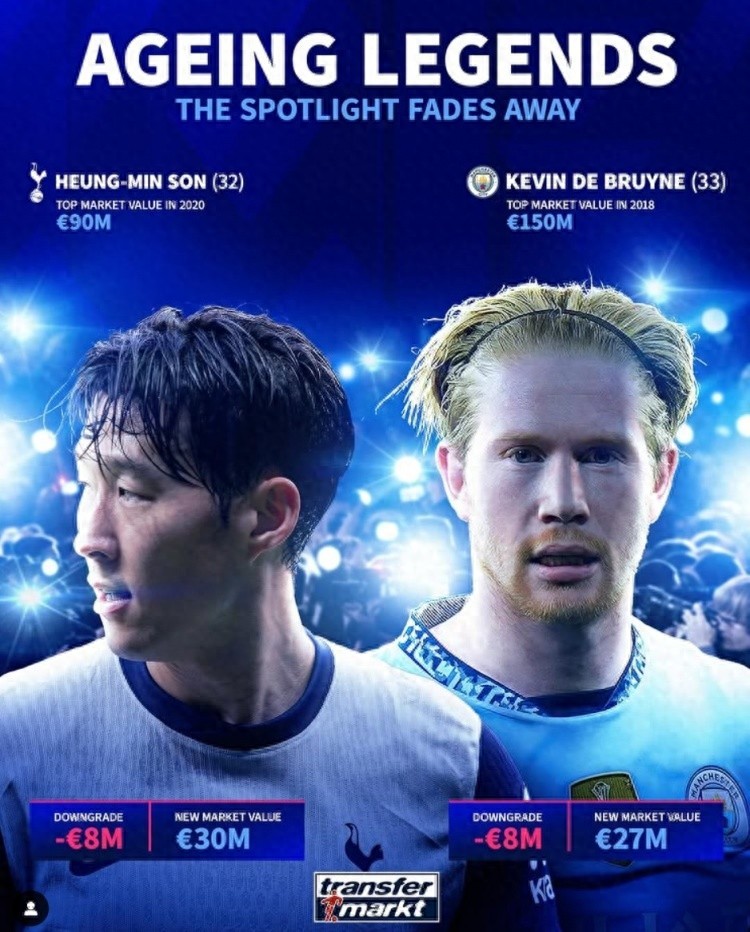 32岁孙兴慜&33岁德布劳内身价各降800万欧,巅峰身价9千万&1.5亿