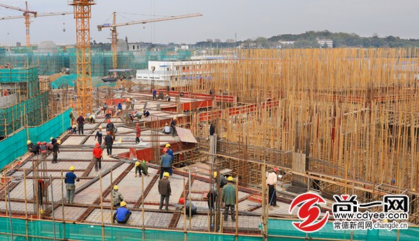 位于常德市柳叶湖东侧的常德卡乐星球文化旅游科技体验园项目于2017年7月开始筹备动工,占地面积约46万平方米。目前,园区内共55栋主题建筑基本进入封顶阶段,总体工程完成45%,预计今年9月28日正式开园试营业。届时市民可体验悬挂过山车、360环球影院、激流勇进等30项游乐项目。图为3月14日繁忙的施工现场。记者 裴维维 摄