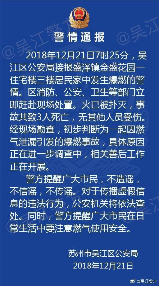 据苏州吴江区公安局通报,12月21日7时25分,吴江区公安局接报盛泽镇金盛花园一住宅楼三楼居民家中发生爆燃的警情。吴江区消防、公安、卫生等部门立即赶赴现场处置。火已被扑灭,事故共致3人死亡;无其他人员受伤。经现场勘查,初步判断为一起因燃气泄漏引发的爆燃事故,具体原因正在进一步调查中,相关善后工作正在开展。