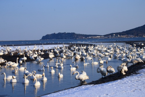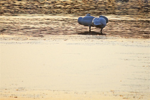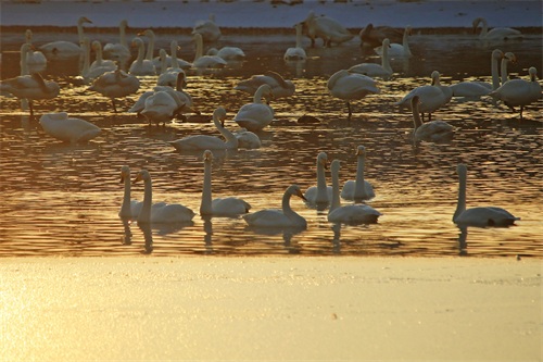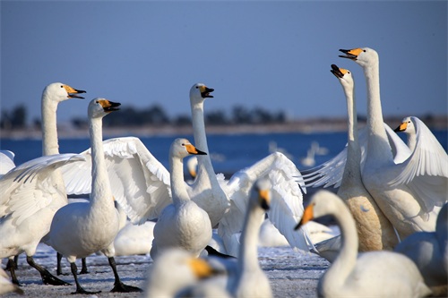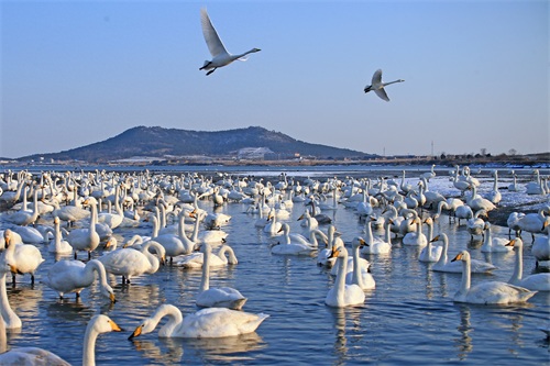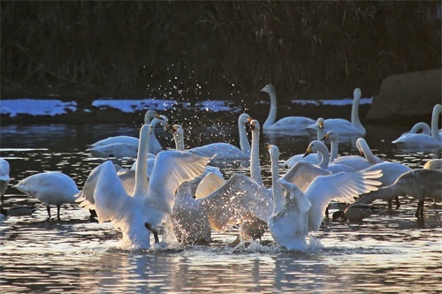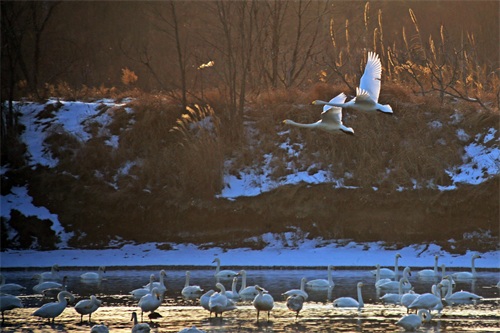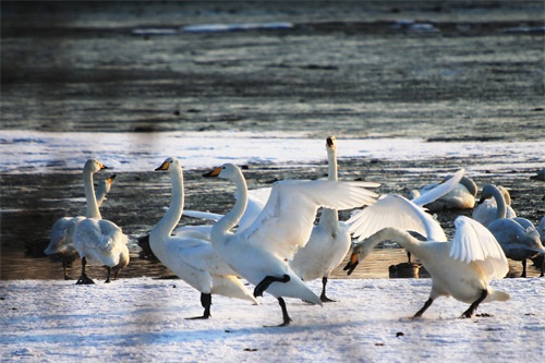 近日,山东省荣成市天鹅湖雪后初霁,成群大天鹅在湖畔追逐、嬉戏、飞舞,演绎冬日浪漫。