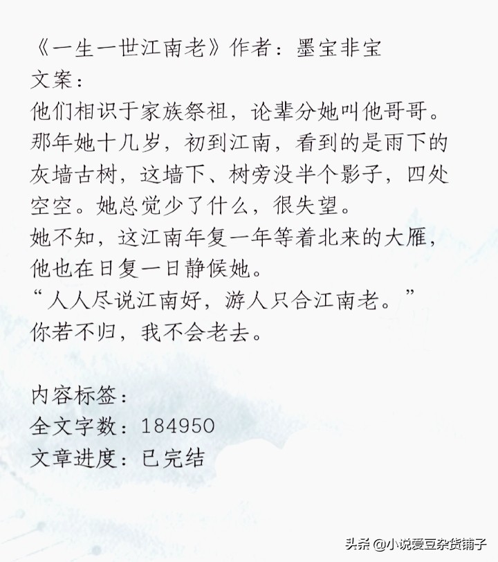 盘点几本兄妹系的甜宠文,看看《一生一世江南老》,墨宝非宝大大