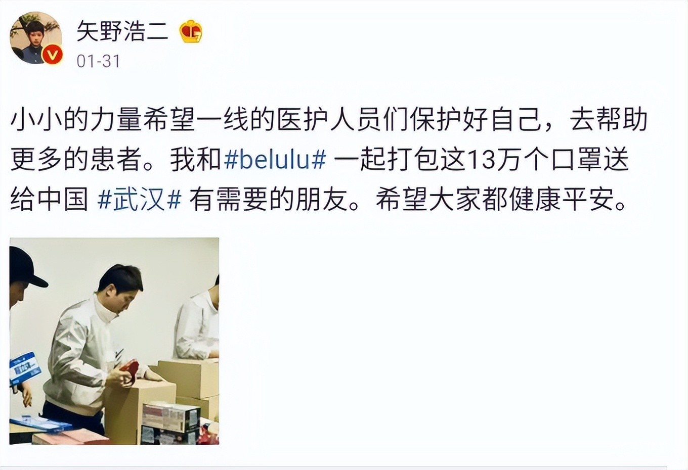 在2020年的突发疫情中,浩二马上从日本购买了13万个口罩,亲自打包送往武汉来支援医护人员。