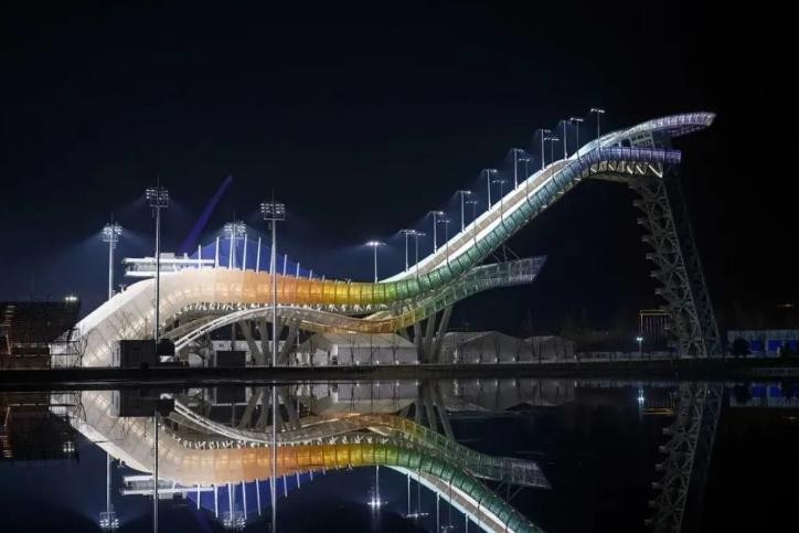 两条落差分别为136.2米和114.7米的赛道,蜿蜒而下。璀璨灯光下,“雪如意”气势宏大,整个建筑在流光溢彩的灯光映射下熠熠生辉。