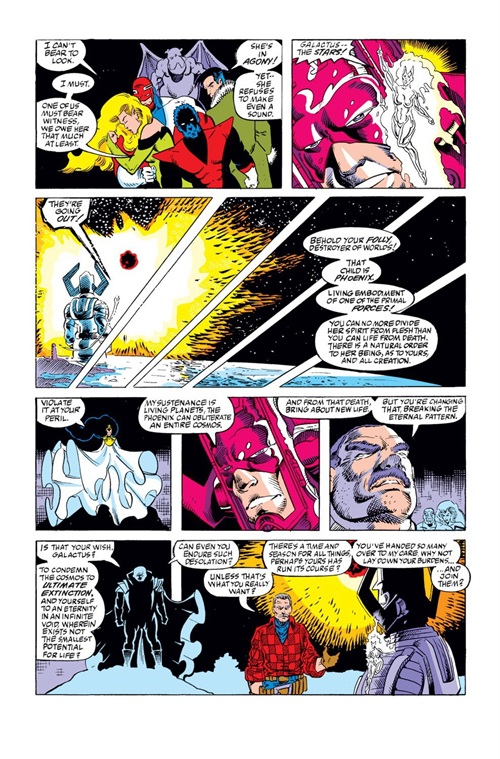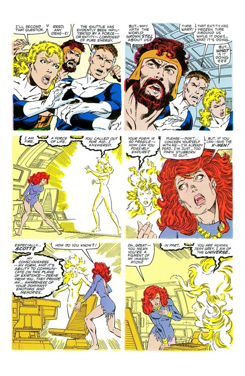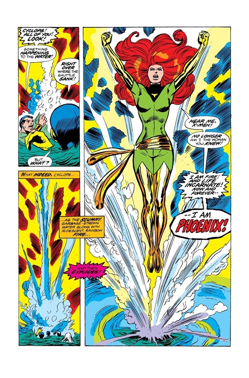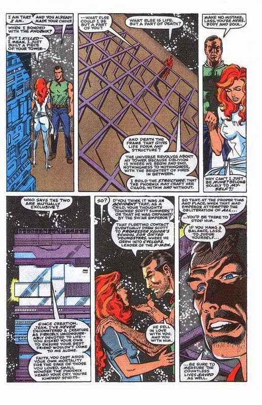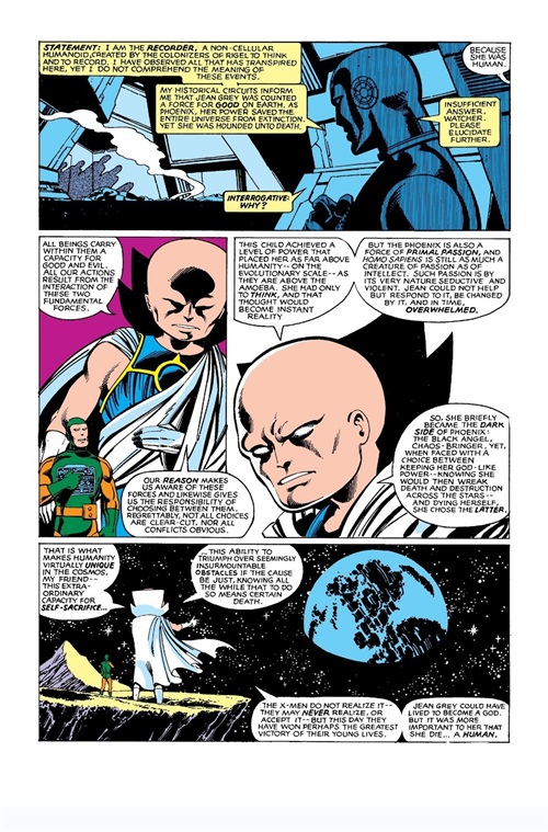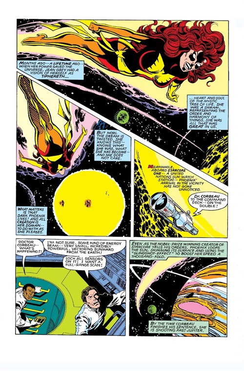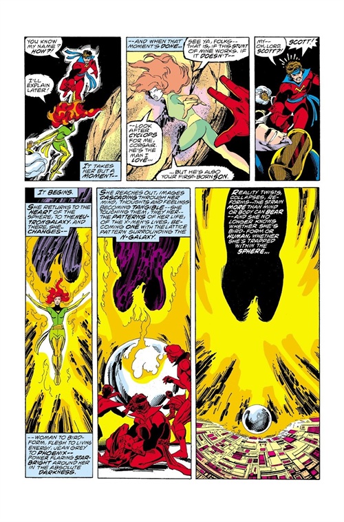 「一切开始了…她回到球体中心,中子星系,在那裡,她转变了…从女人到鸟型,肉体到生命能量,琴·葛雷到凤凰──在她周遭绝对的黑暗中,星光灿烂的力量…」