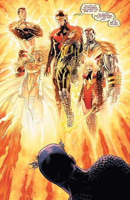 AVX时期,复仇者和X战警在月球上展开战斗,当凤凰快速接近时,钢铁人想出击败凤凰之力的可行方案,藉由使用特殊设计的装甲执行任务,结果非但没有摧毁凤凰,反之将它分裂成五份,每一个部分皆寄宿在不同的X战警成员作为宿主,分别为独眼龙、白皇后、钢人、秘客和纳摩。开始时,凤凰五人组使用他们的力量改变地球,创造和平和先进的土地来居住,许多艰困的地带被赐予需要的天候支持他们,而乌托邦则经历重大的改变,他们提供免费、乾淨和近乎无限的能量给每个人,并且禁止武器的使用。然而随著战斗持续,五人组的心智也逐渐显示出腐化的迹象,为了取得更大的力量自相残杀。