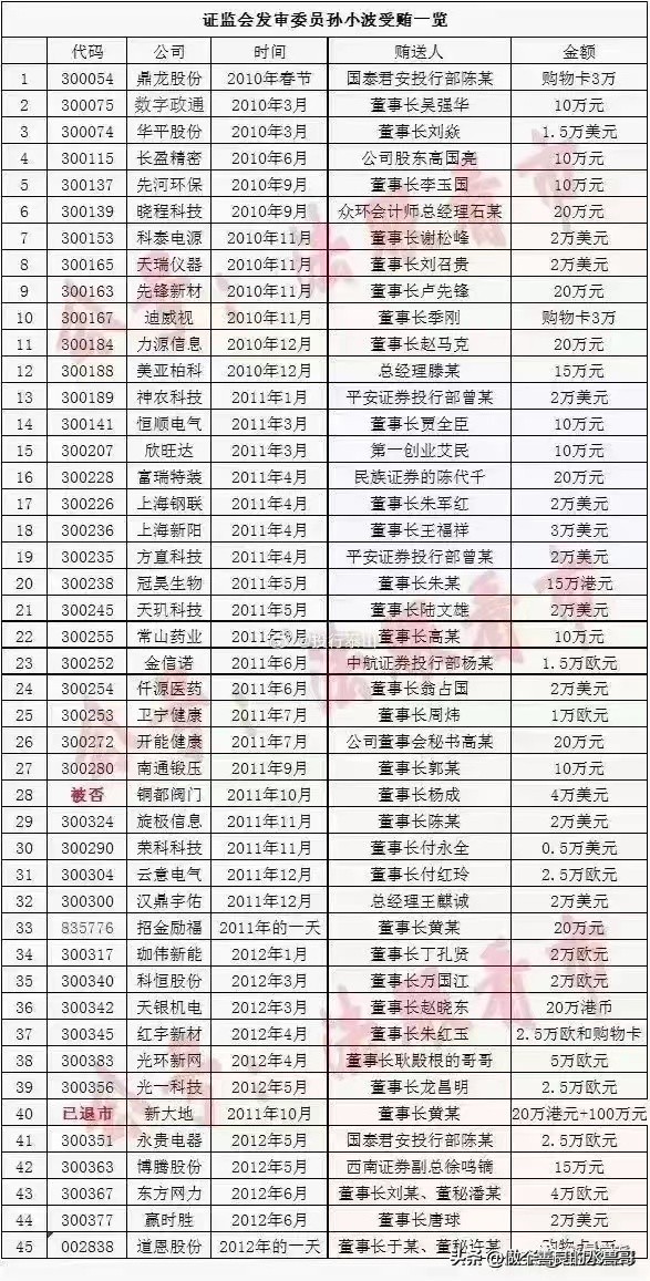 孙小波受贿案牵涉到45家上市公司、拟上市公司,还包括国泰君安、平安证券、民族证券、第一创业、西南证券、中航证券等等在内的多家券商。