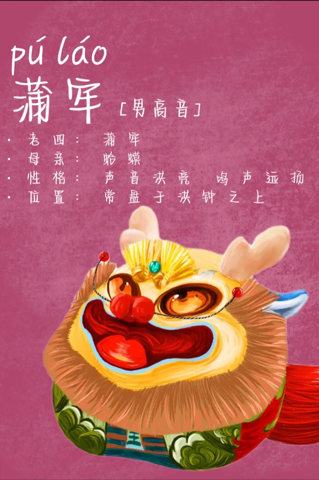 1.长子囚牛:他性格温和,不喜争斗,反而对音律有着极强的天赋。形象上,他有着蛇的身体和龙的脑袋,经常蹲立于琴头,倾听人世间的各种音律。因此,琴头上便刻上它的形象,称为“龙头琴”。
