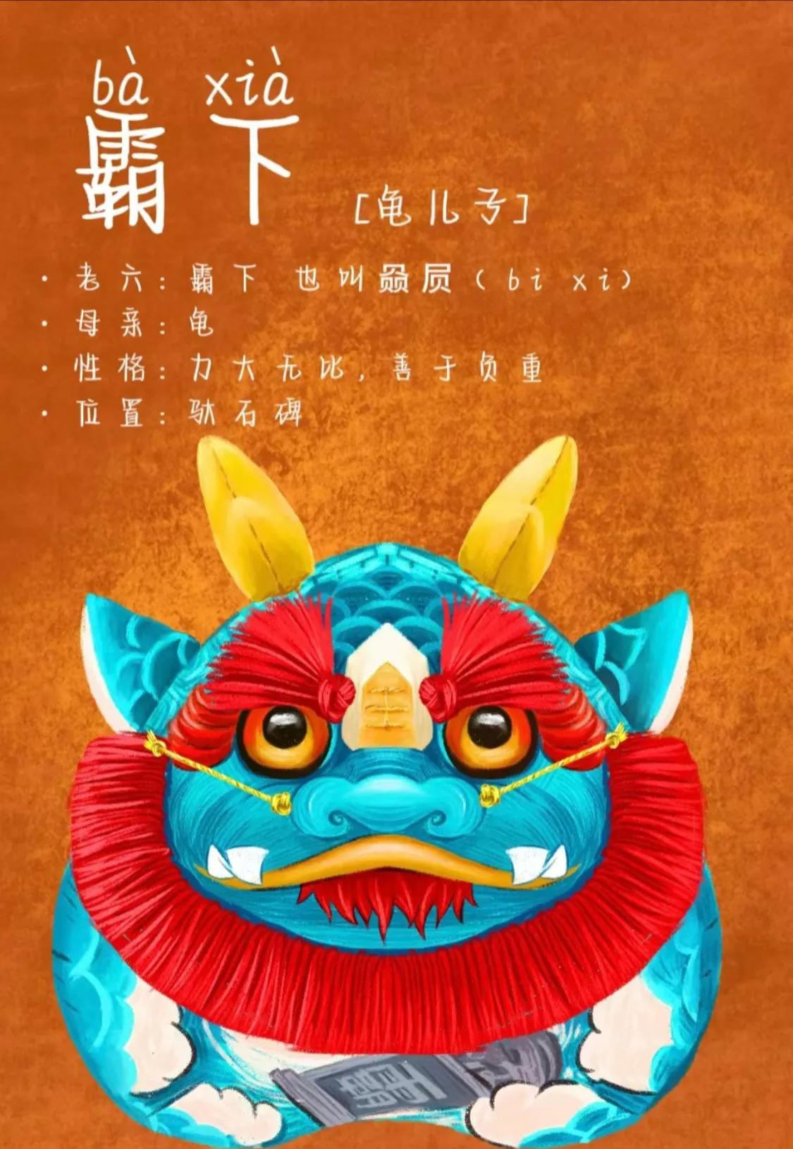 6.六子霸下(又名赑屃):形似龟,力大无穷,喜欢负重,碑下龟是也。他常常背负石碑于宫殿中,是长寿、吉祥、走鸿运的保护神。寓意着承载历史,传承文明。