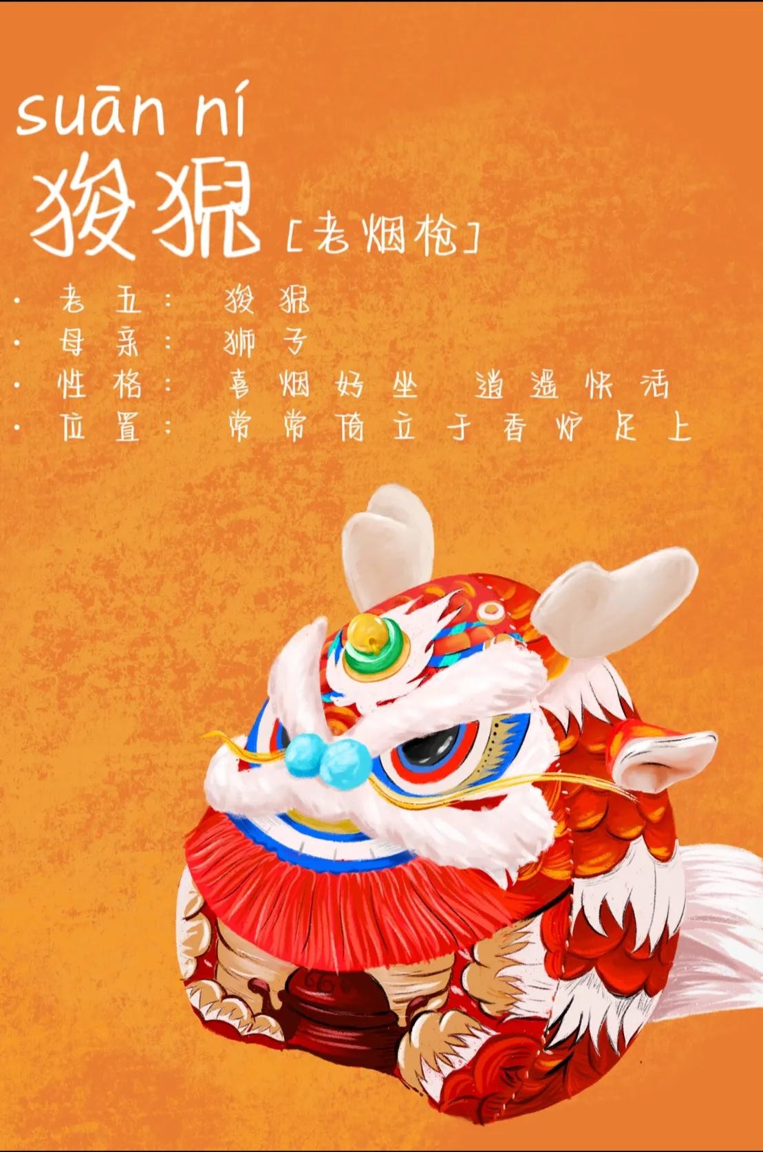 5.五子狻猊:身形宛如狮子,喜欢静坐和烟火。据说佛主见它的耐心好,就收在座下当了佛骑。因此他通常倚立于香炉足上,随之吞烟吐雾。狻猊的形象既威猛又庄严,成为了佛教文化中的重要元素。