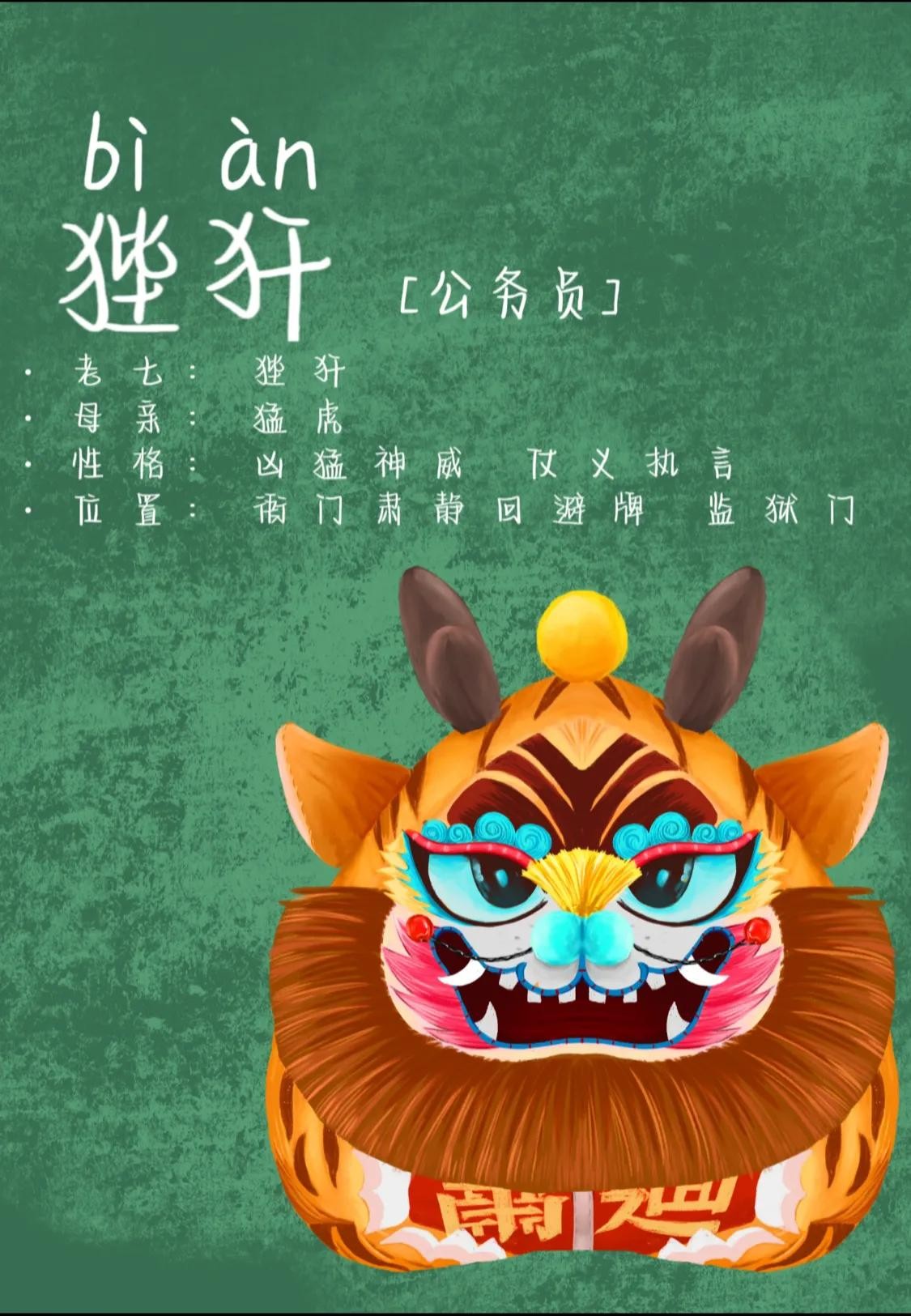 7.七子狴犴:形似虎,有威力,故立于狱门。古人认为狴犴能够震慑罪犯,维护社会秩序。因此,将狴犴的形象刻在狱门上,寓意着法律的威严与公正。