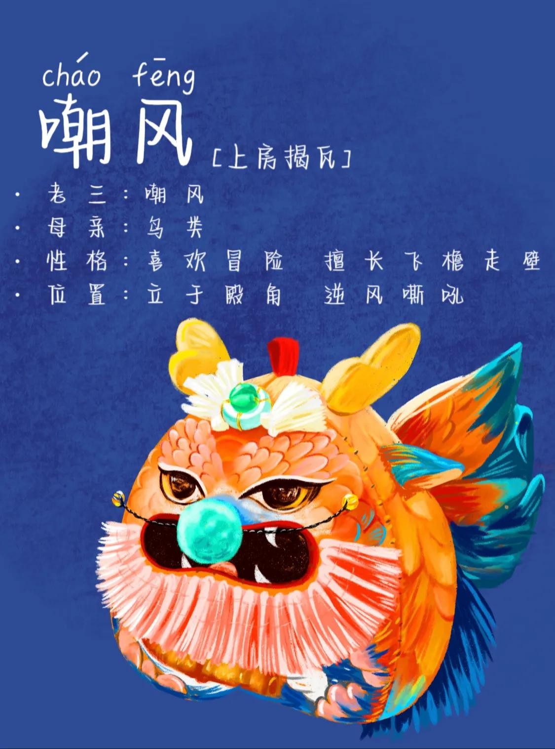 3.三子嘲风:是一种瑞兽,喜欢探险和眺望远处。因此,殿台角上的走兽就是它。古人将其安置在殿角,既能驱邪避凶,又能增加建筑的气势,寓意着守护和镇宅。嘲风的形象富有想象力,为古代建筑增添了一抹神秘的色彩。
