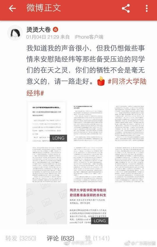 1月4日,微博名为“烫烫大卷”的网友,通过微博发布信息称,同济大学医学院硕士研究生陆经纬,常年被其导师压榨,365日无休,最终,于2018年12月13日跳楼身亡。
