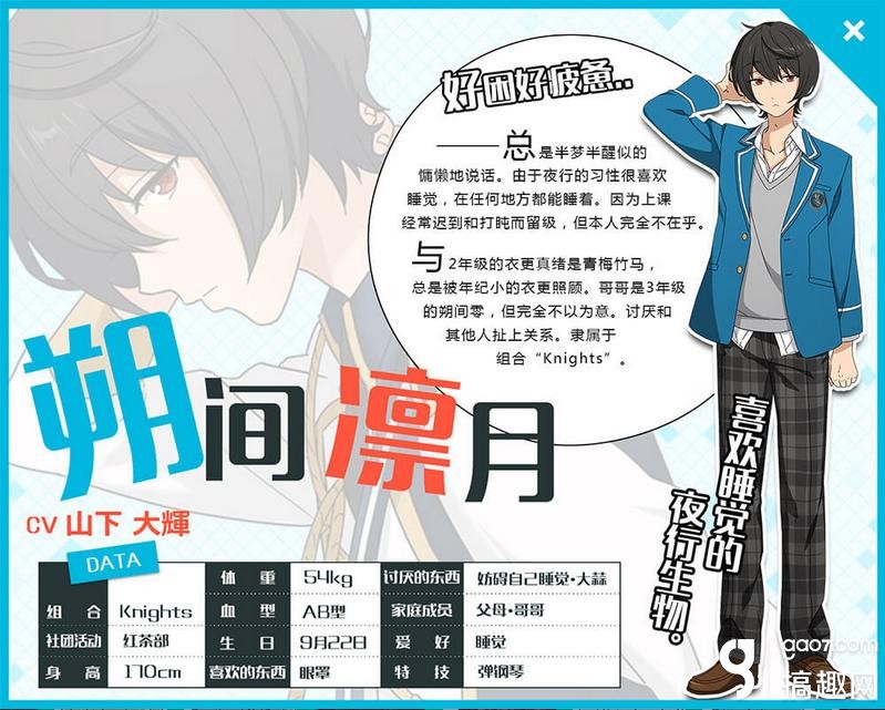 与二年级的衣更真续是青梅竹马,总是被年纪小的衣更真续照顾,哥哥是三年级的朔间零,但完全不以为然,讨厌和其他人扯上关系,隶属于组合Knights。