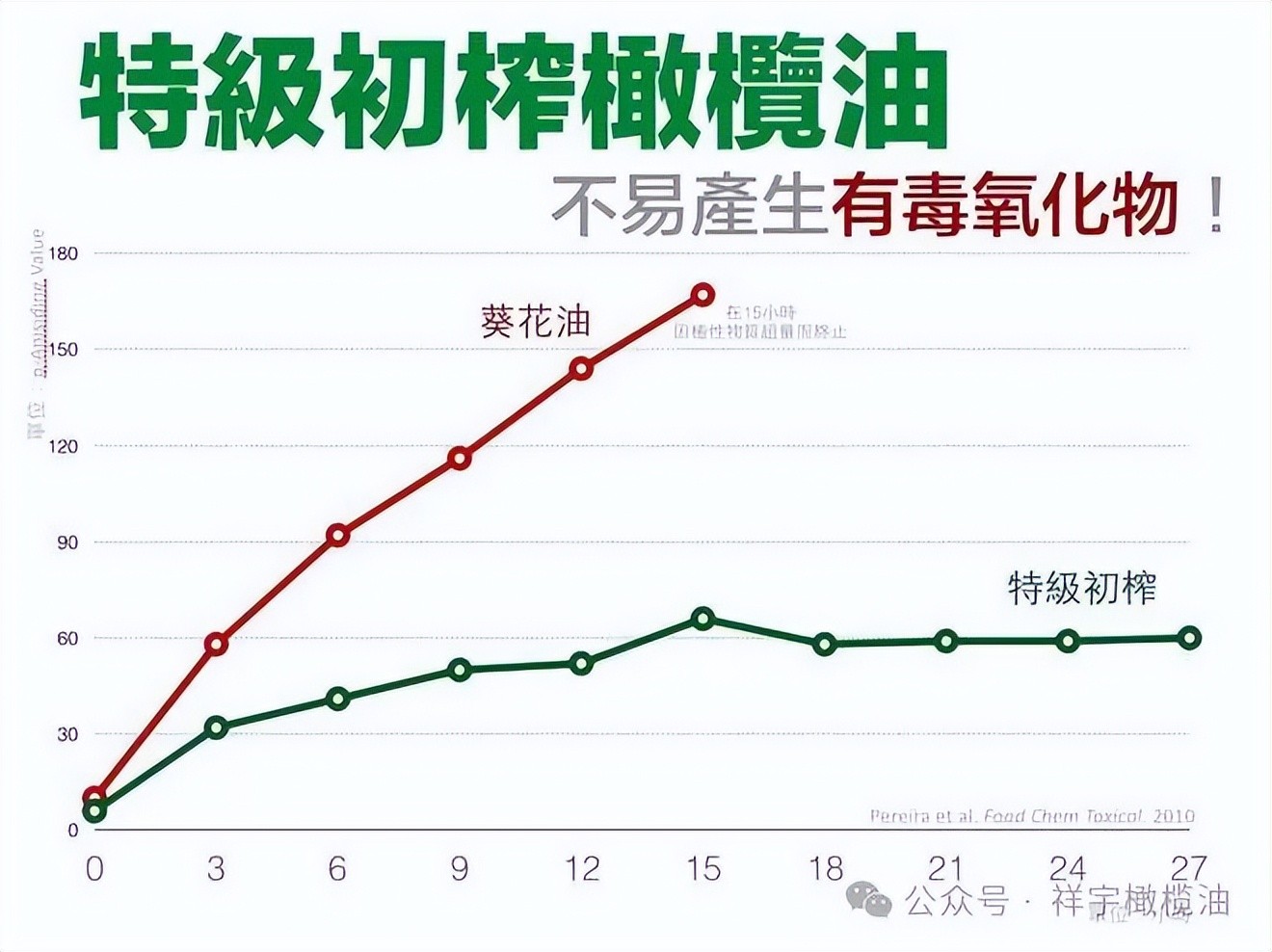 在一项实验中,有学者拿特级初榨橄榄油(单元不饱和脂肪酸)与葵花油(多元不饱和脂肪酸)来油炸超过24小时,从下图可以明显看出,特级初榨橄榄油,抗氧化剂含量更高,稳定性更好。