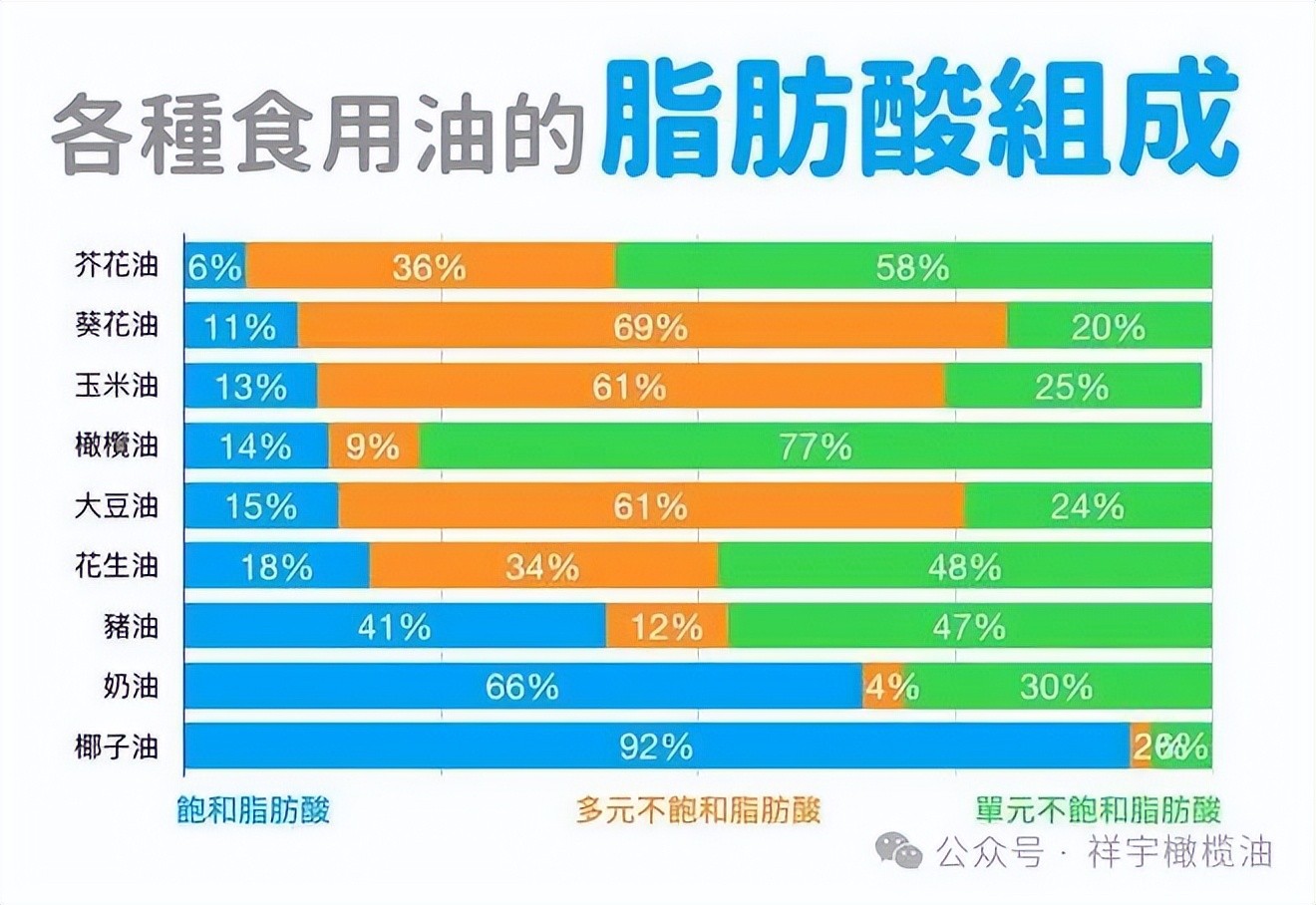 以下是一些常见油品的脂肪酸成分表,多元不饱和脂肪成分越高者,在高温下的稳定度通常也越差。