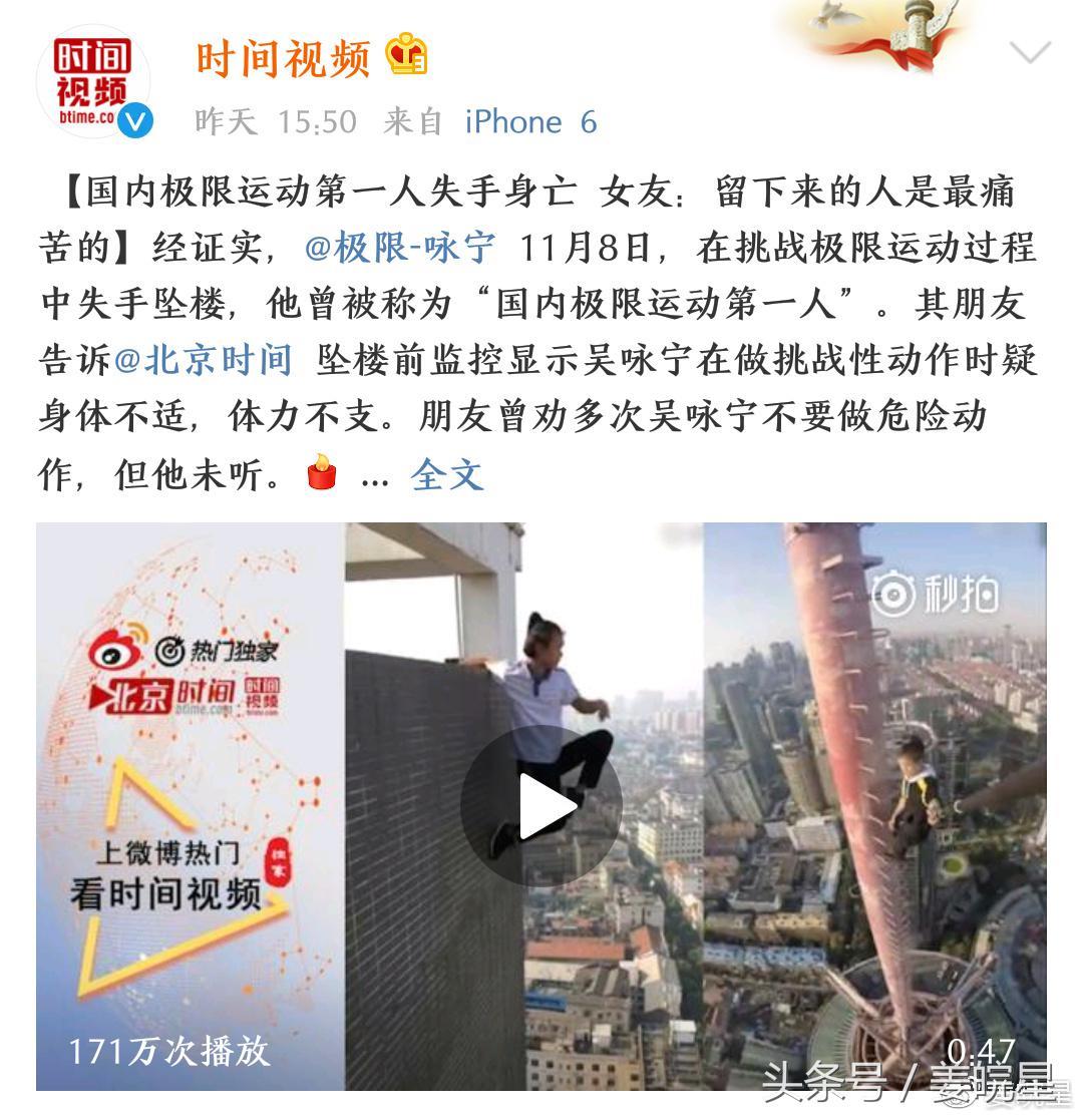 引言:当得知国内极限运动达人咏宁不幸坠楼身亡的消息后,相信每一个人都很震惊!尤其像我们这些健身爱好者,更替他感到痛心不已,躺在床上,刷着事件相关的新闻,久不能寐,索性起床,想写点什么,有些话,不吐不快……
