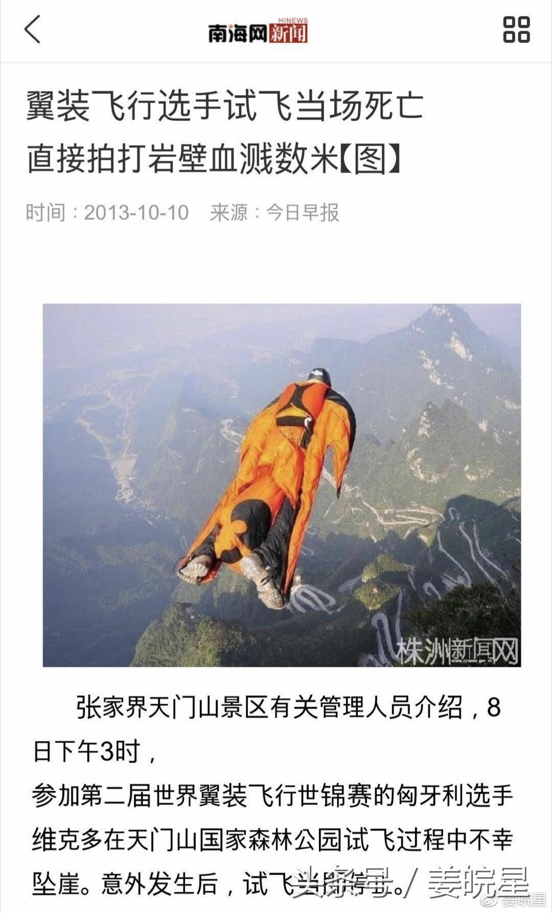 划重点:写了这么多,就是想说明一件事,连极限运动专家们都经常会有生命危险,你一个极限运动爱好者(或达人),凭什么信心十足地对自己的家人朋友们保证你的耍帅100%安全?这本身就是对自己生命的大冒险以及对家人对社会的不负责。年轻人希望获得关注,希望有光环,希望有成就感这没什么问题,但得接地气,在空中跳来跳去的,你真当自己是鸟人?