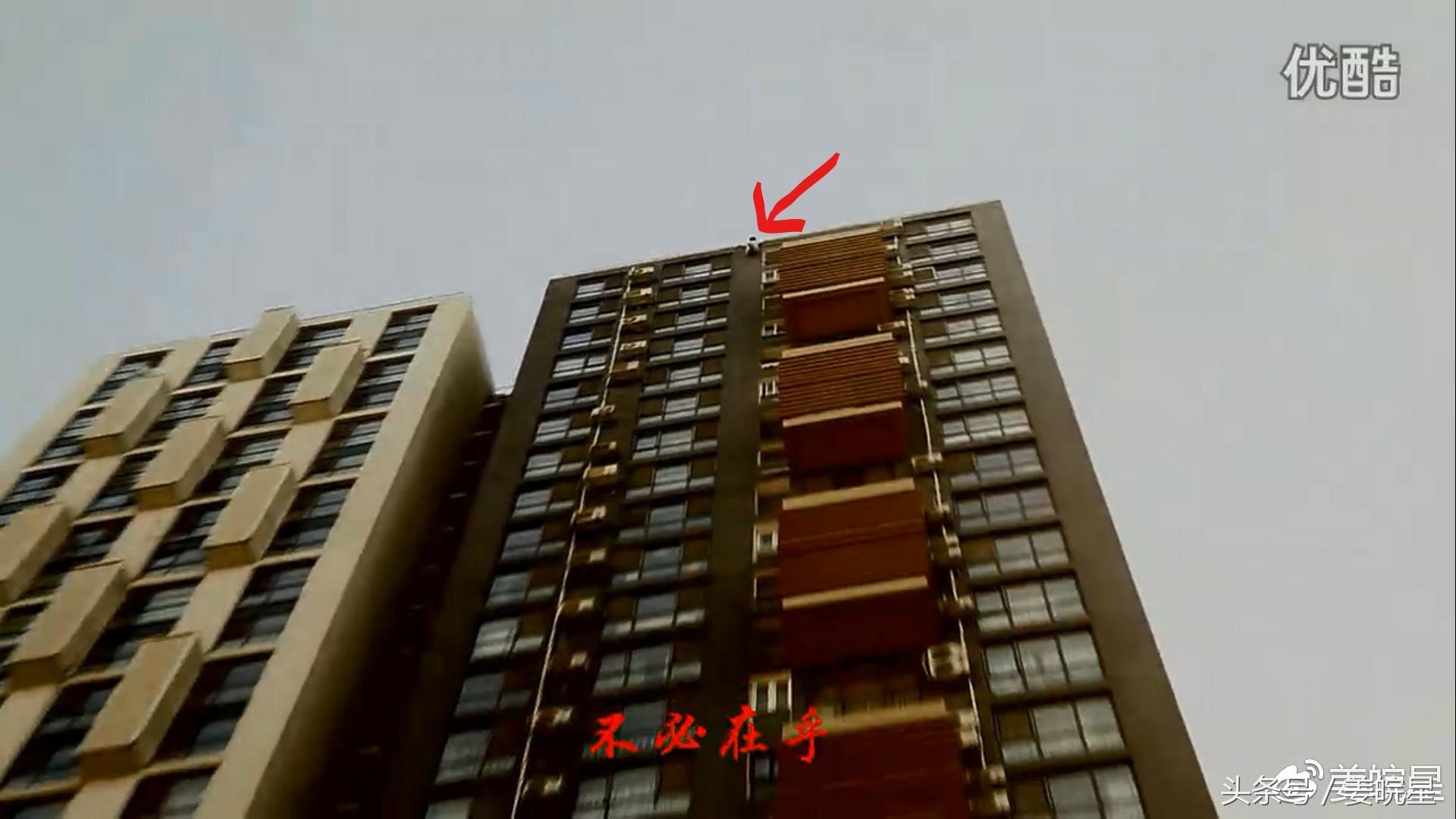 再将镜头拉远,仅用双手抓住顶楼边缘的岳松几乎都快看不见了(依然用醒目的红箭头标注了他的位置,大家可以放大看)↓